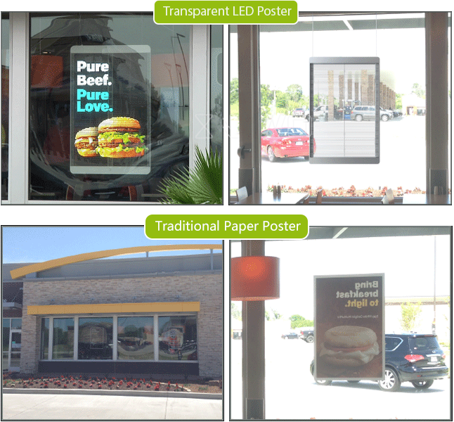 Unlike static posters that block light and view, transparent LED displays allow natural light to pass through while keeping an unobstructed view of your storefront, creating an open and inviting appearance.
